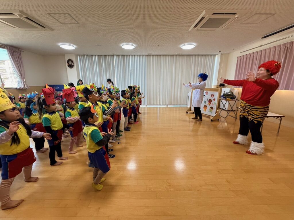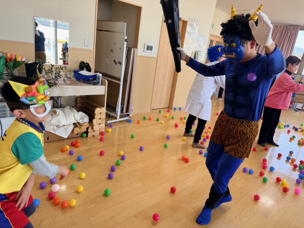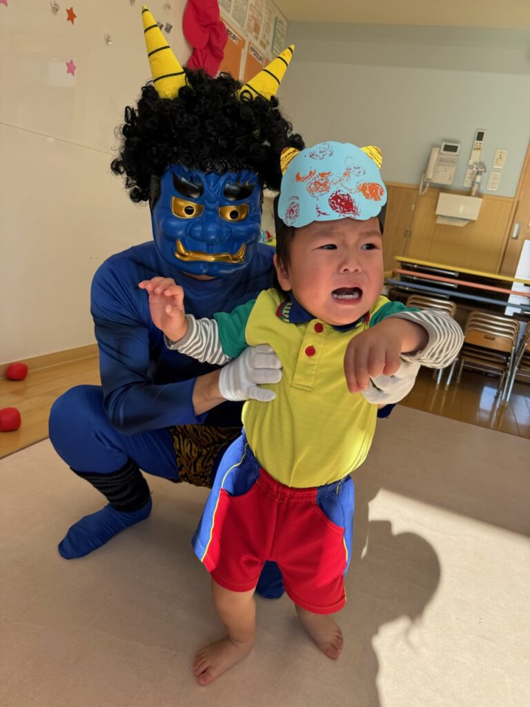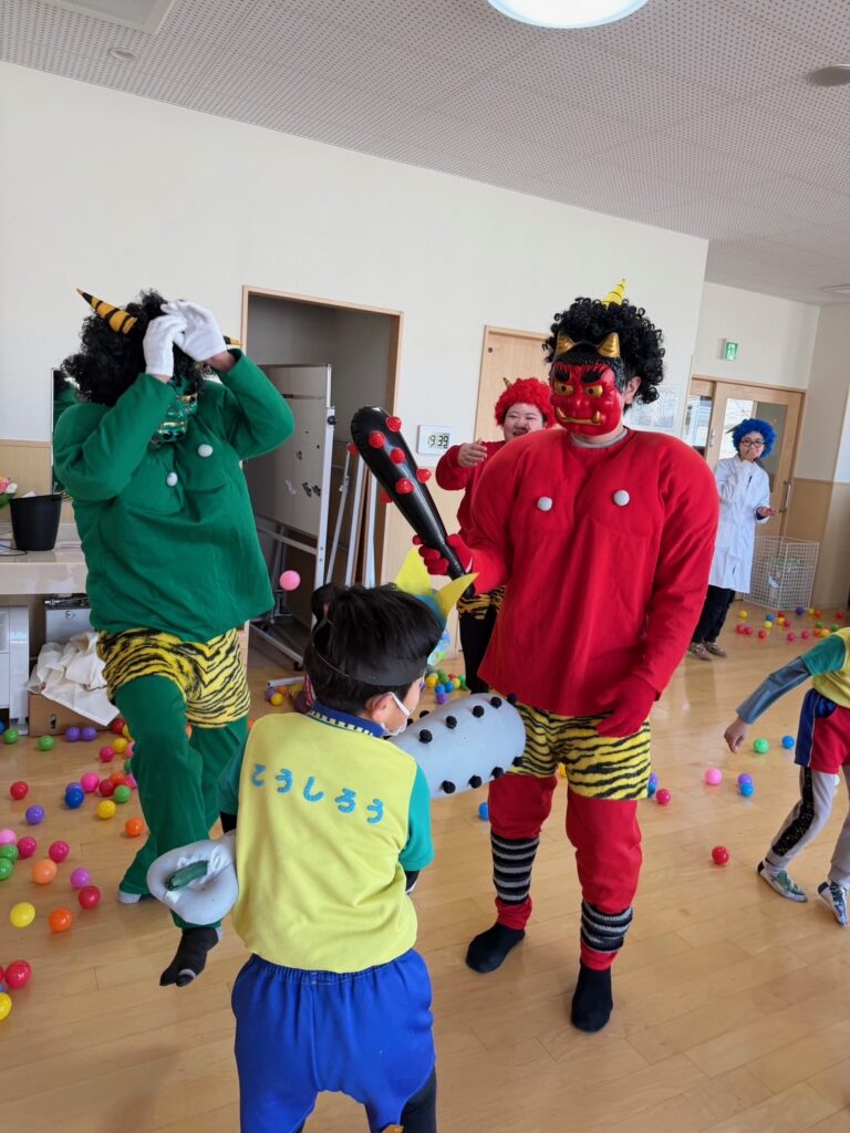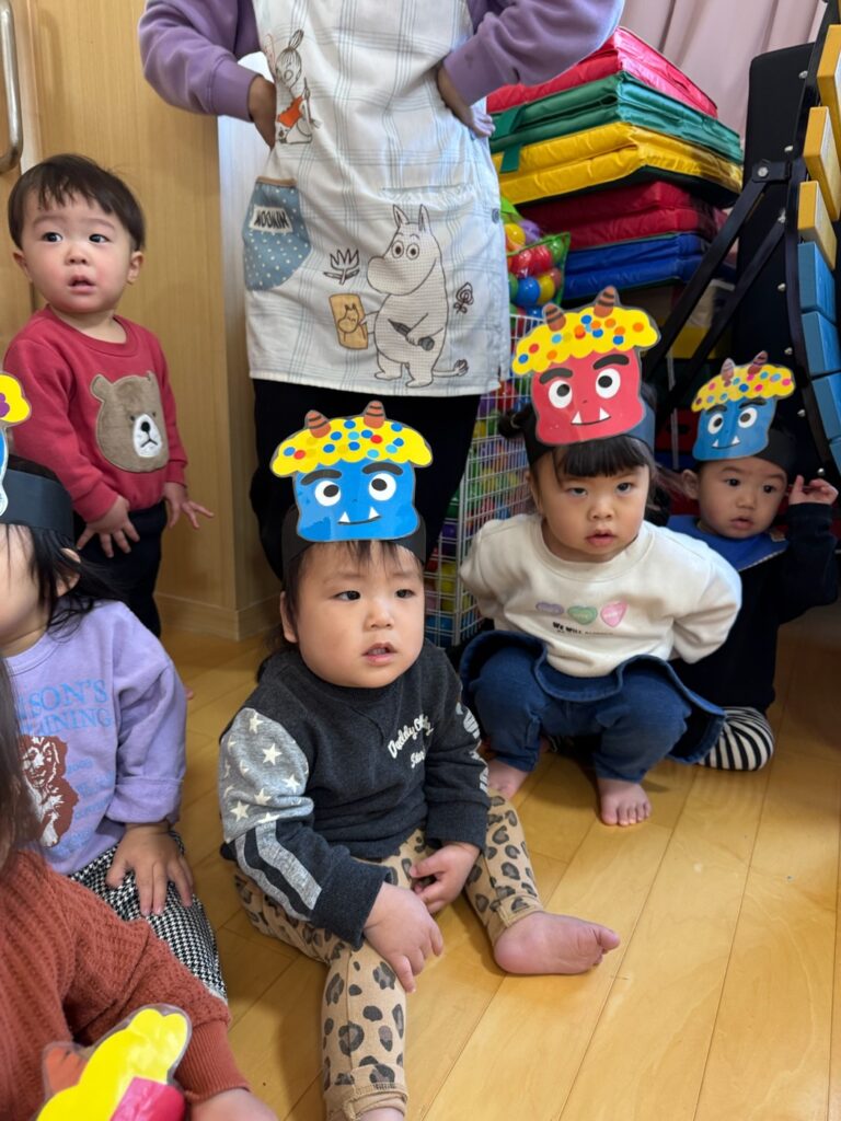 今日は節分。伝統行事のいわれをみんなで学習‼ みんなで「豆まき」の歌が終わったとと同時に”ドドン ドドドド~ ドンドン”と不気味な太鼓の音と共に、3人の鬼たちが”悪い子はおらんか~ッ! 親の言うことをきかん子はおらんか~ッ! と乱入してきました❣ ご想像のとおり、”鬼は~ソトー!、外~ッ‼”(”福はうち”が聞こえなかったヨ)と叫びながらカラーボールを投げる子、ただただ泣く子…などなど。 今日お家で話題になることと思います💛 *お手伝い下さった3人のお父さん、お仕事を休んでまで子どもたちのために、本当にありがとうございました…その子どもたちは最後まで「パパ」だとは気づかないままでした…(笑)