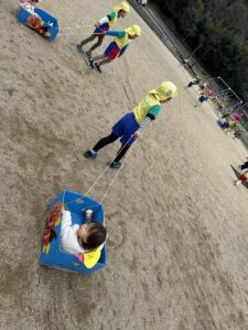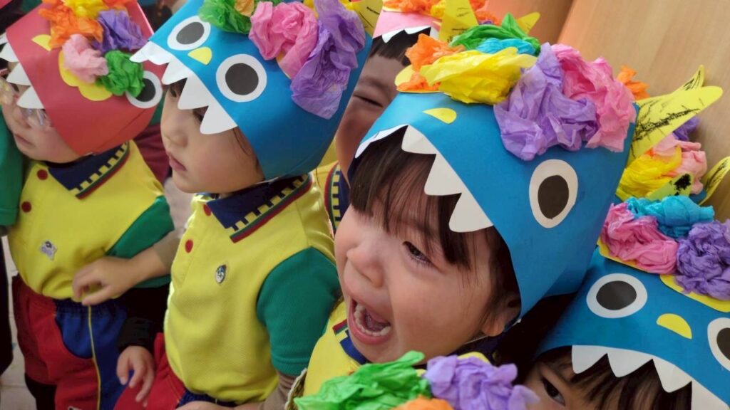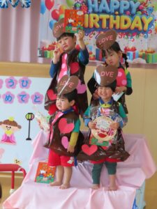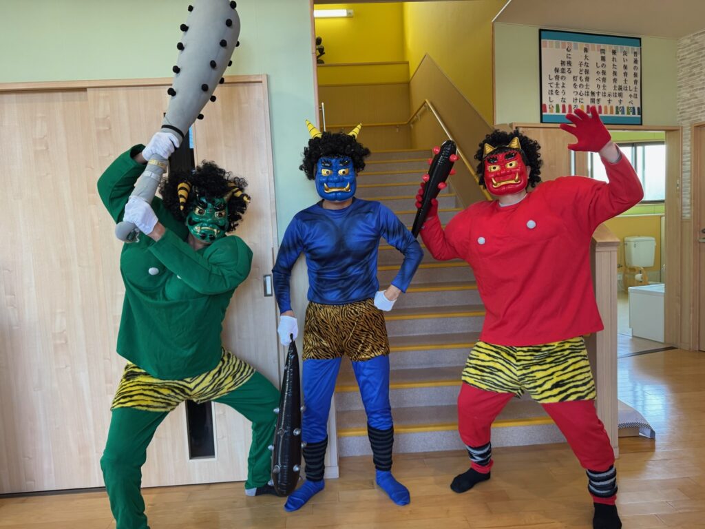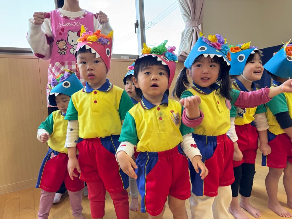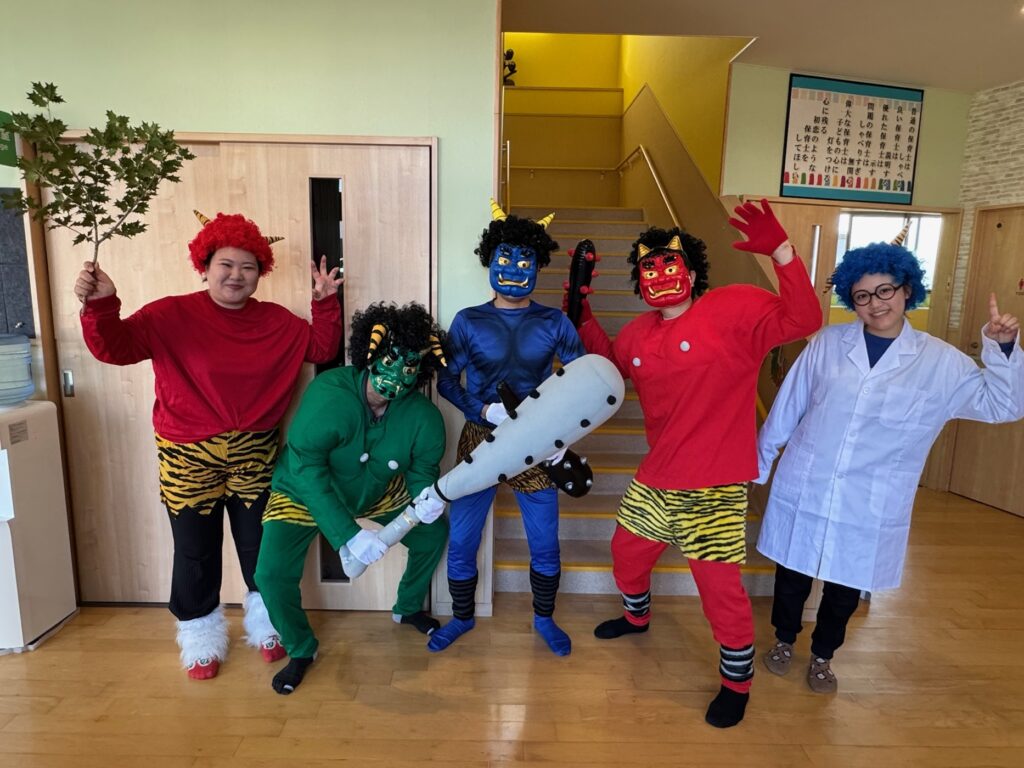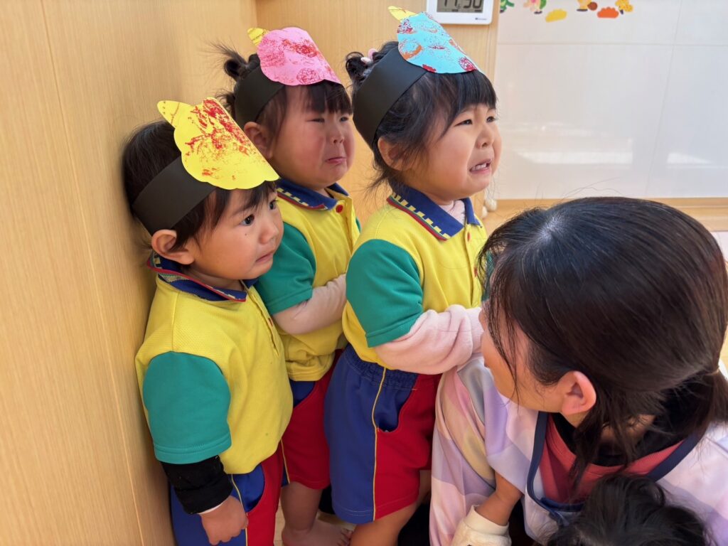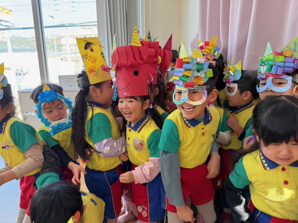 今日は節分。伝統行事のいわれをみんなで学習‼ みんなで「豆まき」の歌が終わったとと同時に”ドドン ドドドド~ ドンドン”と不気味な太鼓の音と共に、3人の鬼たちが”悪い子はおらんか~ッ! 親の言うことをきかん子はおらんか~ッ! と乱入してきました❣ ご想像のとおり、”鬼は~ソトー!、外~ッ‼”(”福はうち”が聞こえなかったヨ)と叫びながらカラーボールを投げる子、ただただ泣く子…などなど。 今日お家で話題になることと思います💛 *お手伝い下さった3人のお父さん、お仕事を休んでまで子どもたちのために、本当にありがとうございました…その子どもたちは最後まで「パパ」だとは気づかないままでした…(笑)