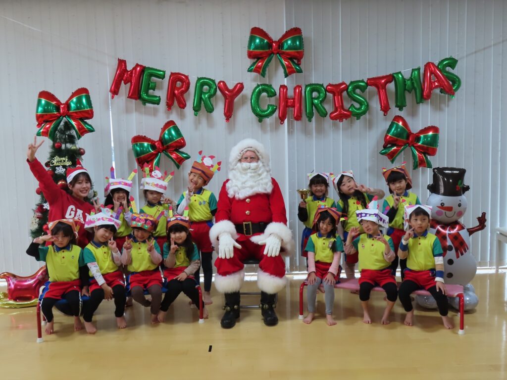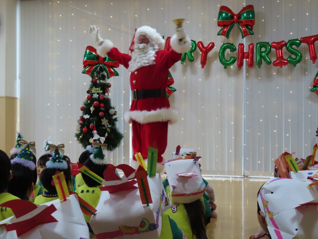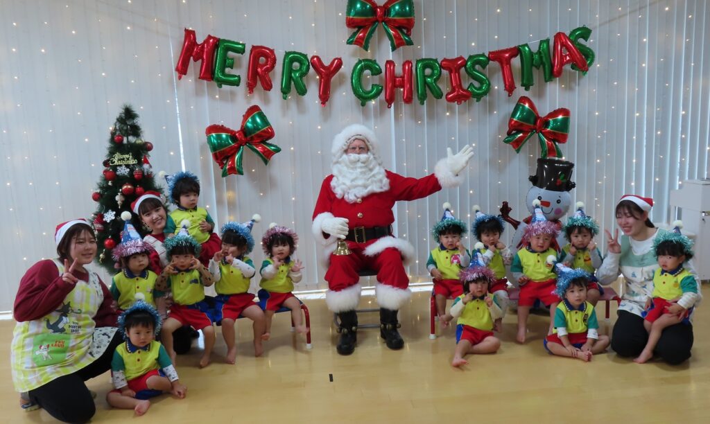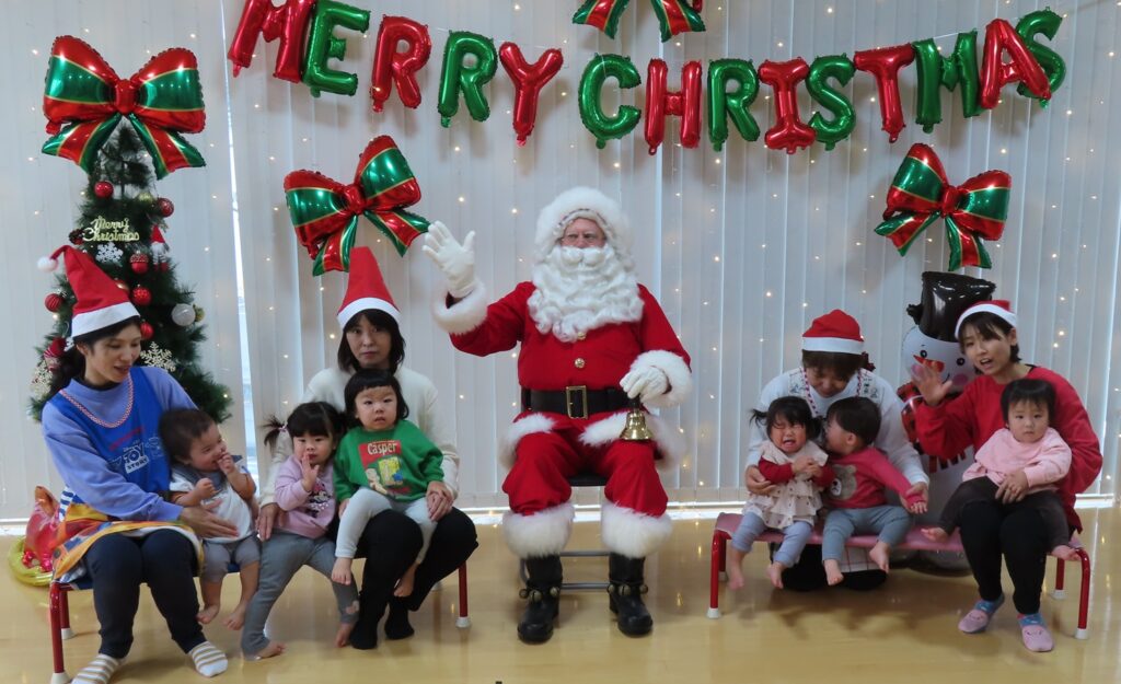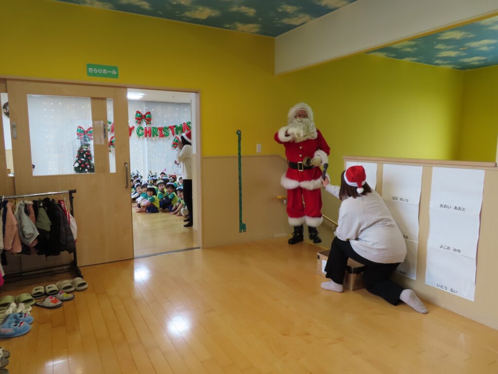 今日24日はクリスマスイブです💖 外国人の「サンタさん」がやってきました! 子どもたちは大きな(身長が高い)サンタさんに驚きながら、ちょっと緊張した表情でしたよ💓 ”みんなゲンキですね~!”と外国語なまりの日本語で褒められて、これまた緊張しながらも喜んでいました。クラス別に写真を撮って”あわてんぼうのサンタクロース”の合唱でお礼をしました🍰…(オーストラリア人の方でパークプレイスにこの時期だけ「サンタ」で来ています。当園とひばりこども園はパークのイベントによく出演することから、そのお礼にと来てくれました💕)