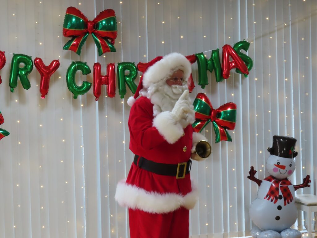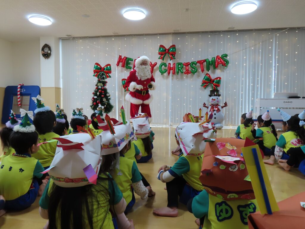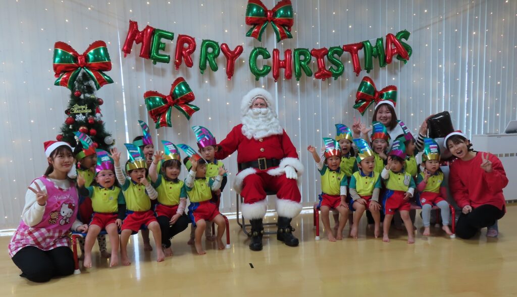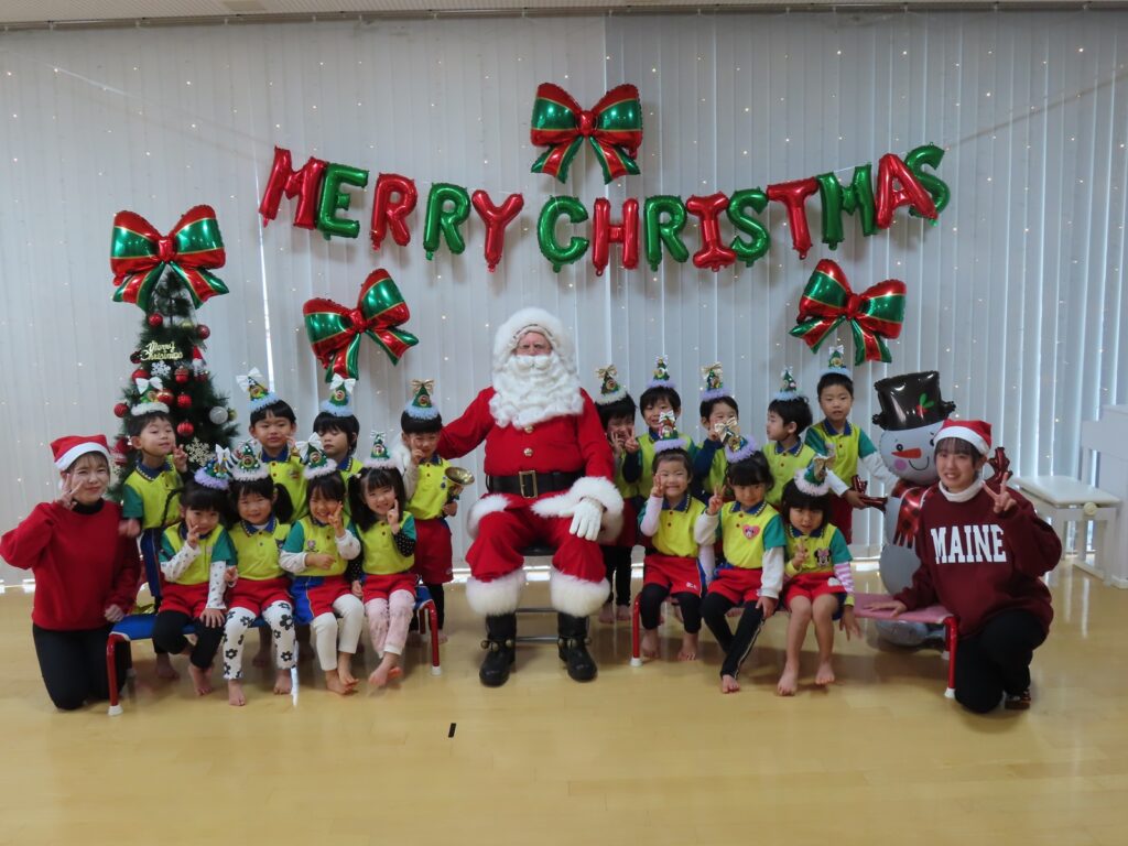 今日24日はクリスマスイブです💖 外国人の「サンタさん」がやってきました! 子どもたちは大きな(身長が高い)サンタさんに驚きながら、ちょっと緊張した表情でしたよ💓 ”みんなゲンキですね~!”と外国語なまりの日本語で褒められて、これまた緊張しながらも喜んでいました。クラス別に写真を撮って”あわてんぼうのサンタクロース”の合唱でお礼をしました🍰…(オーストラリア人の方でパークプレイスにこの時期だけ「サンタ」で来ています。当園とひばりこども園はパークのイベントによく出演することから、そのお礼にと来てくれました💕)