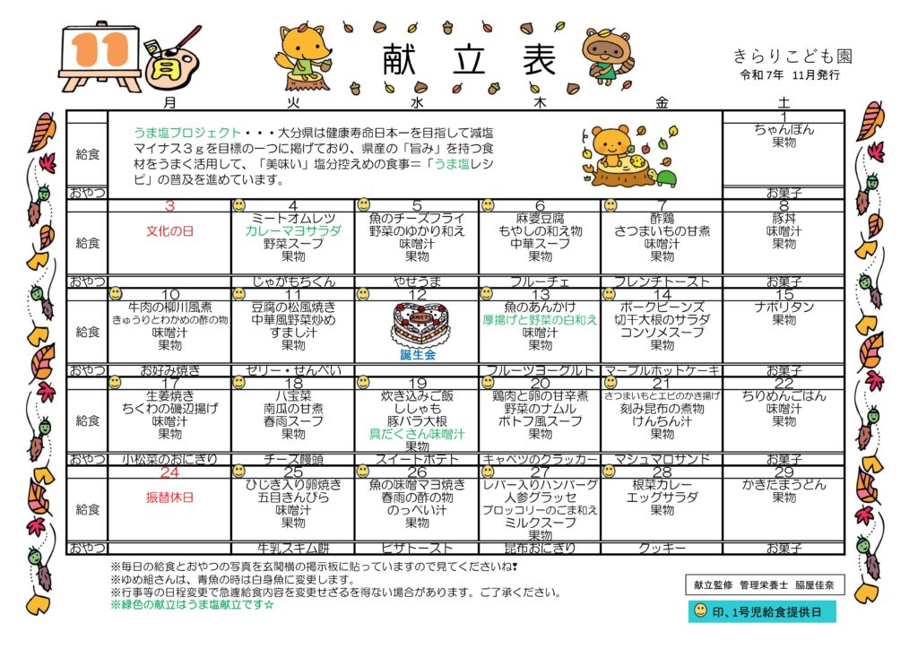 11月号「園だより」「献立表」 2025 11/01 お知らせ 2025年11月1日 今月は、1日(土)パークプレイス大分のイベントに出演をします。つき、ほしの女子ダンス、つき男子の和太鼓、全員でハロウインダンスなど、14時~・16時~の2回公演です。 また、みかん狩りや高崎山チャレンジ登山、七五三など行事が盛りだくさんです。 お知らせ よかったらシェアしてね! URLをコピーしました! URLをコピーしました! 秋まつり 関連記事 秋まつり 2025年10月21日 ぶどう狩りに行ったよ🍇 2025年10月10日 10月の園だよりと献立表 2025年9月29日 8月・9月生まれのお友だち💖 2025年9月22日 9月の園だよりと献立表 2025年8月29日 産山村ヒゴタイ公園 2025年8月29日 サマーキャンプ 2025年8月12日 河川プール面白かったよ❣ 2025年8月1日
