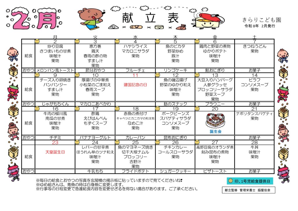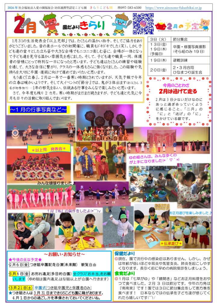 2月の「園だより」「献立表」です。 2026 2/05 お知らせ 2026年2月2日2026年2月5日 お知らせ よかったらシェアしてね! URLをコピーしました! URLをコピーしました! 2025年度 ひばり・きらり合同生活発表会「以上児の部」 令和7年度ひばり・きらり合同生活発表会「以上児の部」 関連記事 つき組合同お別れ遠足に行ってきました💕 2026年3月18日 七瀬公園でいっぱい遊びました💖 2026年3月13日 みどり牧場マザーランドで遊んだよ! 2026年3月13日 お別れ遠足🍱 2026年3月6日 3月号「園だより&献立表」 2026年3月2日 誕生会(2・3月生まれ)&ひなまつり会🎎 2026年2月20日 ひなまつり活動取材 2026年2月19日 鬼たちがやってきた~❣ 2026年2月3日