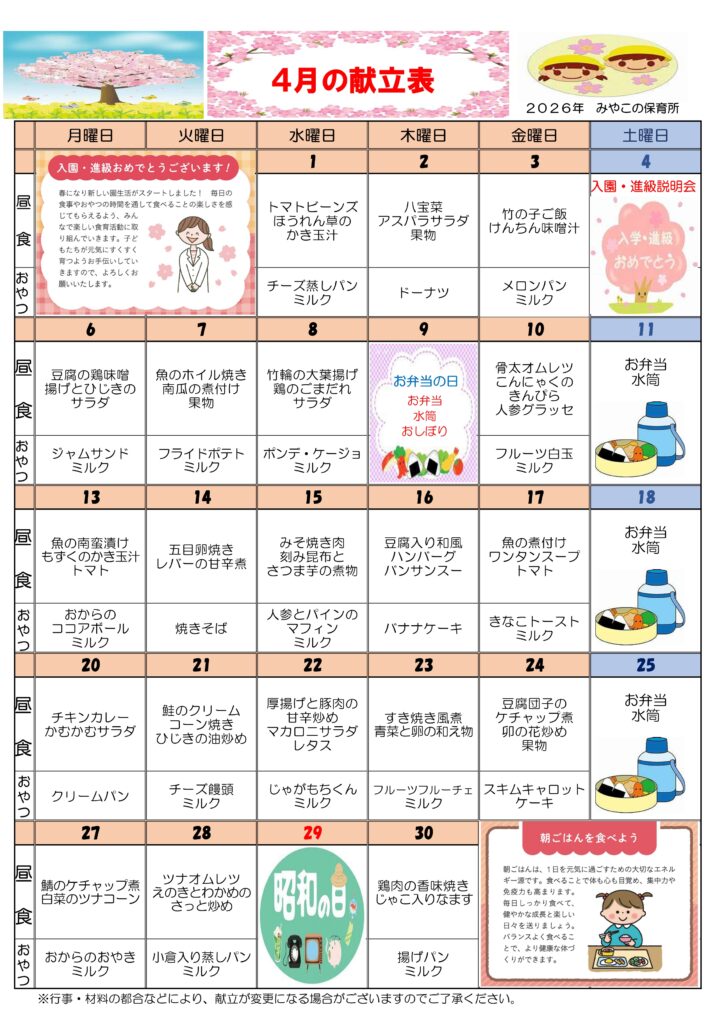 4月園だより・献立表 2026 4/13 お知らせ 2026年4月13日 お知らせ よかったらシェアしてね! URLをコピーしました! URLをコピーしました! 3月園だより・献立表 玄関に現れました! 関連記事 玄関に現れました! 2026年4月20日 3月園だより・献立表 2026年2月27日 2月園だより・献立表 2026年2月27日 11月号「園だより」「献立表」 2025年11月1日 10月号「園だより」「献立表」 2025年11月1日 9月号「園だより」「献立表」 2025年11月1日 8月の「園だより」「献立表」 2025年11月1日 7月の園だよりと献立表 2025年7月7日